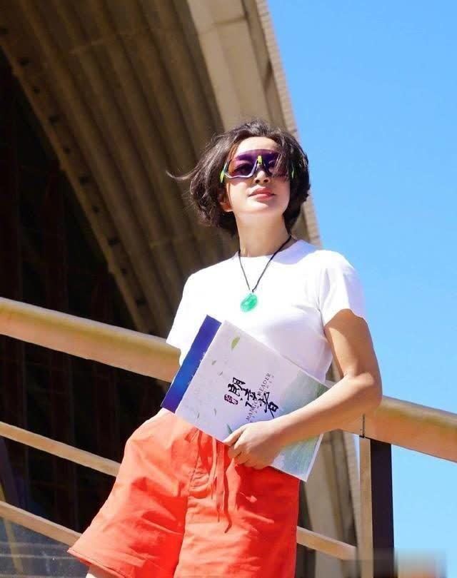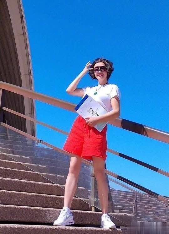 下半身搭配亮眼的红色短裤,高饱和度色彩特别吸睛,提亮了整个搭配。脚上的白色运动鞋舒适又减龄,完美契合整体风格,完全看不出她的真实年龄。